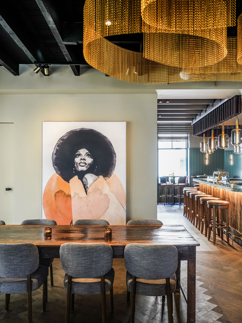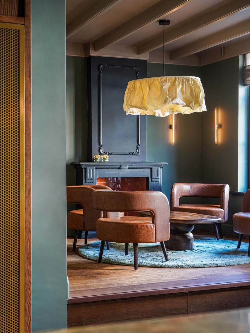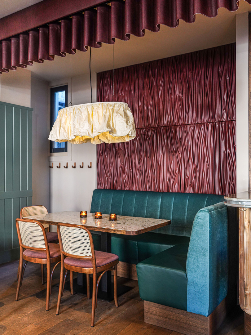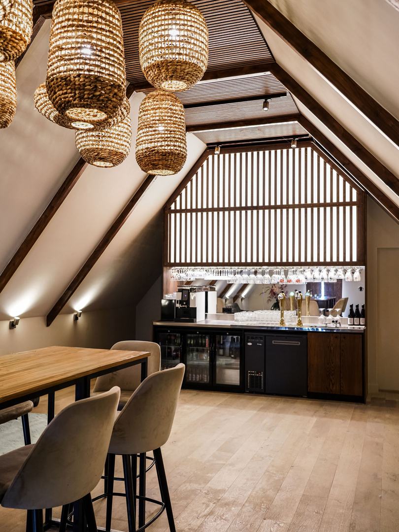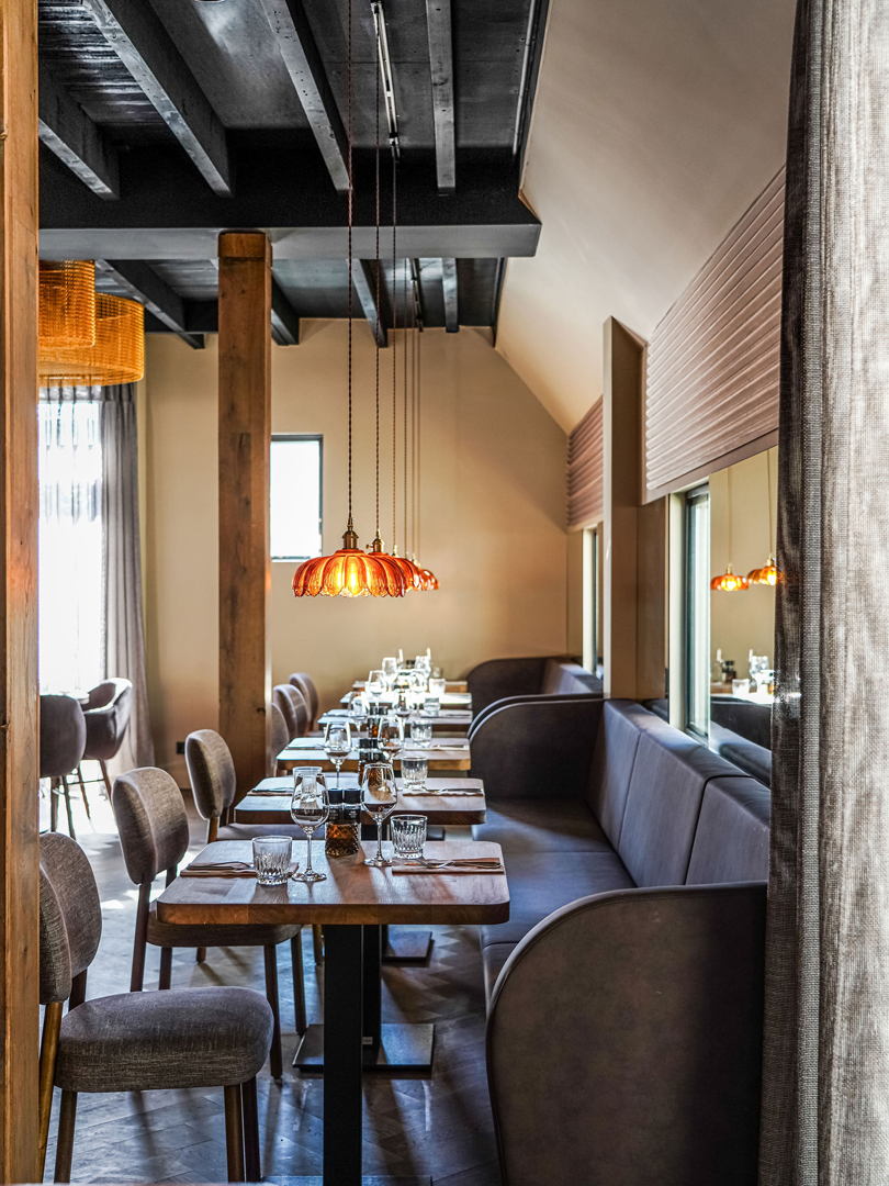 Binnen het restaurant vormt het plafondelement een centraal ontwerp gebaar. Dit element is een abstractie van de tabaksschuur die zich eerder op deze locatie bevond. De vorm en opbouw verwijzen naar deze geschiedenis, zonder letterlijk te reconstrueren, en dragen bij aan de identiteit van de ruimte.