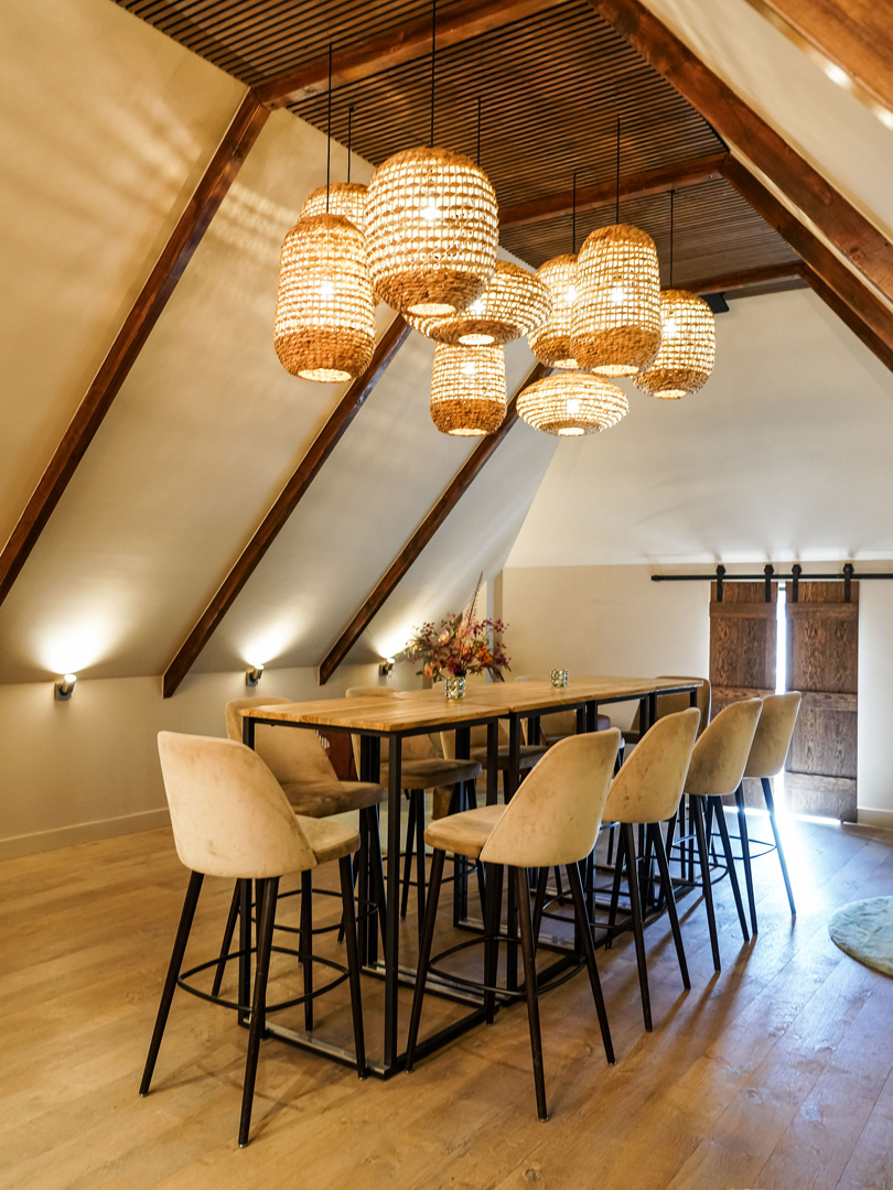 Het interieurontwerp is ontwikkeld vanuit de geschiedenis van het pand, dat oorspronkelijk diende als boerderijwoning. Deze achtergrond is vertaald naar het interieur in sfeer, materialisatie en detaillering. Referenties naar de boerderij zijn subtiel aanwezig en vormen een belangrijk onderdeel van de ruimtelijke beleving.